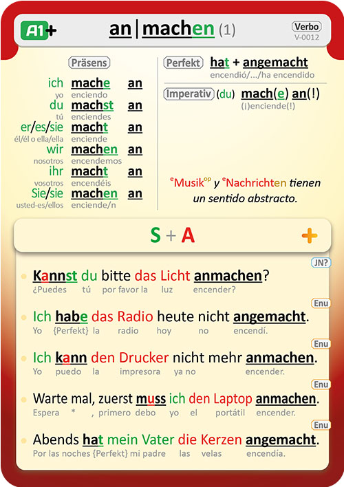 Las cartas muestran las palabras en un sistema de colores para identificar los tipos de palabras, funciones y casos gramaticales. De esta manera puedes visualizar mejor la fórmula, la gramática y la estructura de la oración.